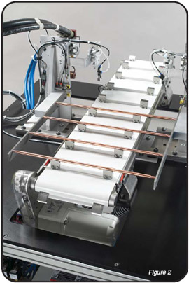 The RoboTherm™ system (pictured above) simultaneously anneals both ends of copper rods in an inert gas environment. Prior to the use of this system, the ends of the copper rods were annealed with hand-held gas torches. This laborious, time consuming method had the following disadvantages: