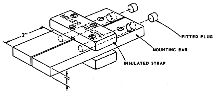 The solid-copper mounting bars are provided with cooling water passages to within 2 inches of coil mounting end. Considerable latitude is allowed for fixture attachment; simply drill and tap for mounting screws where required, using care to avoid cooling water passages. To attach coil, first locate the desired positions of coil ends on the bars. From these points, machine passages of suitable size to connect with the pre-machined cooling water passages. Align with coil ends inserted in passage, then silver braze or soft solder to bar. The fitted plugs should now be silver brazed or soft soldered in the rear opening of  the cooling water passage and the entire unit pressure tested  for leaks and flow.